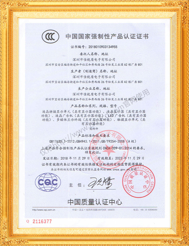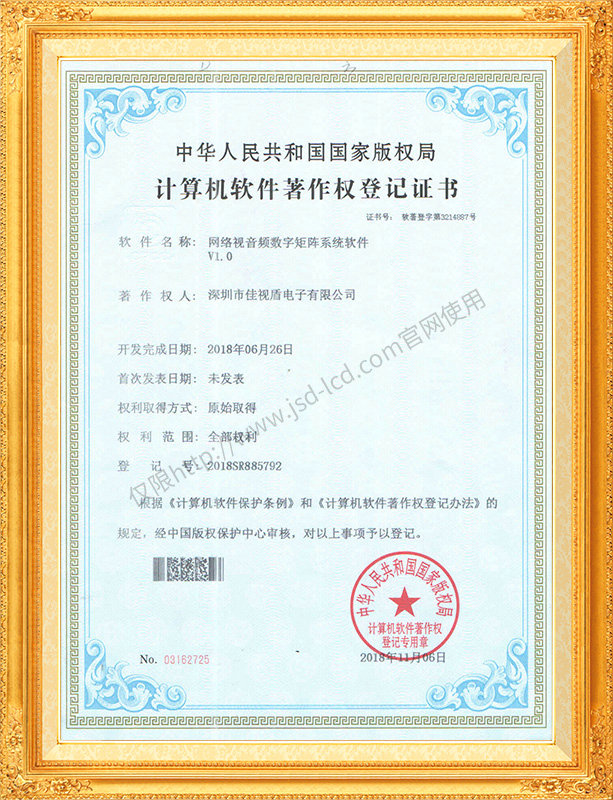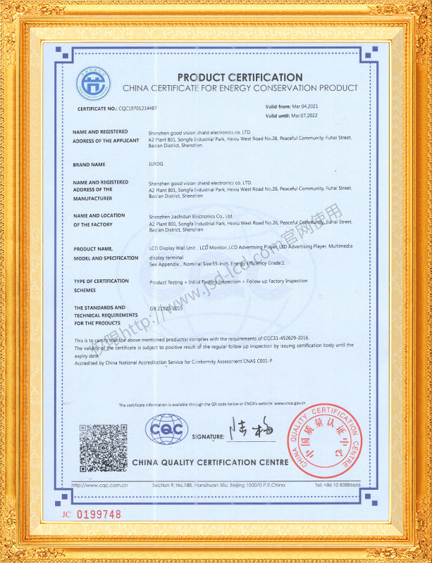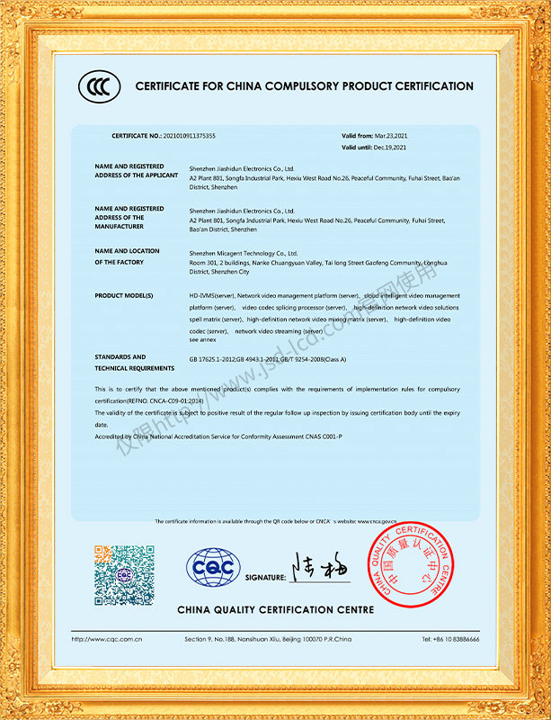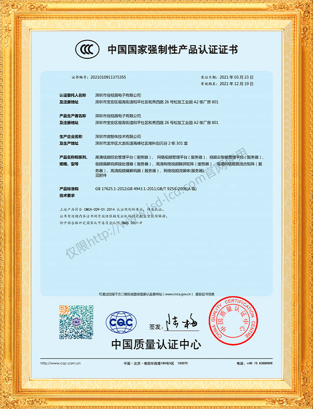 佳視盾科技采用了科學(xué)現(xiàn)代化管理模式,公司和產(chǎn)品通過了CCC、CB、CE、FCC、ROHS、ISO9001、職業(yè)健康管理體系、環(huán)境管理體系,中國節(jié)能認(rèn)證、多項認(rèn)證,取得多項專利技術(shù)及多項軟件著作權(quán), 并獲得國家及行業(yè)協(xié)會的多項榮譽證書,所有產(chǎn)品均經(jīng)過嚴(yán)格老化檢測及測試,達(dá)到行業(yè)優(yōu)等品的出貨標(biāo)準(zhǔn)。